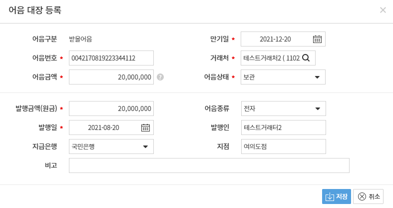 - 어음구분 : 등록할 어음에 대한 (받을어음, 지급어음) 구분 선택