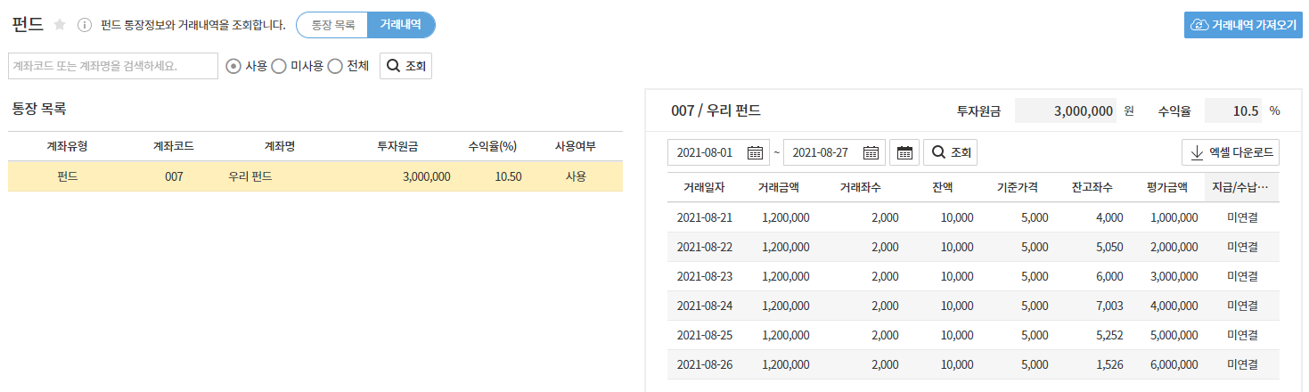 - 펀드 계좌의 투자원금, 수익율, 잔액 정보 관리 가능