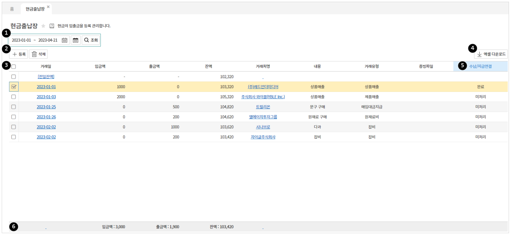 - 합계 : 조회한 전체 내역의 입금액, 출금액 합계와 조회조건의 종료일 기준 현금잔액 확인 가능