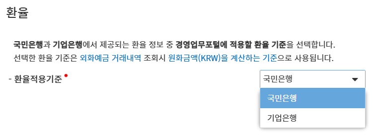 - 환율 적용 기준 은행은 🧭통합설정⚙️ > [앱 관리] > [경영업무포털] > [금융] > [환율]에서 국민은행/기업은행으로 변경 가능