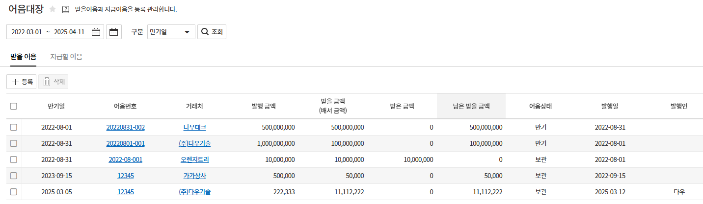 어음은 미래의 지급을 약속한 문서입니다. 받을어음(매출)과 지급어음(매입)을 따로 관리하며, 실제 은행 시스템과 연동되지 않고, 사내 보조용으로 관리하는 기능입니다.