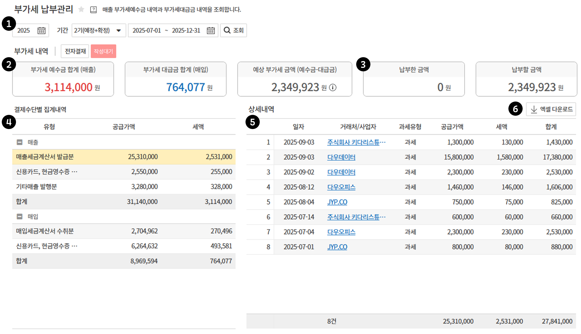 - 부가세 신고를 위한 기초자료를 엑셀 다운로드 가능