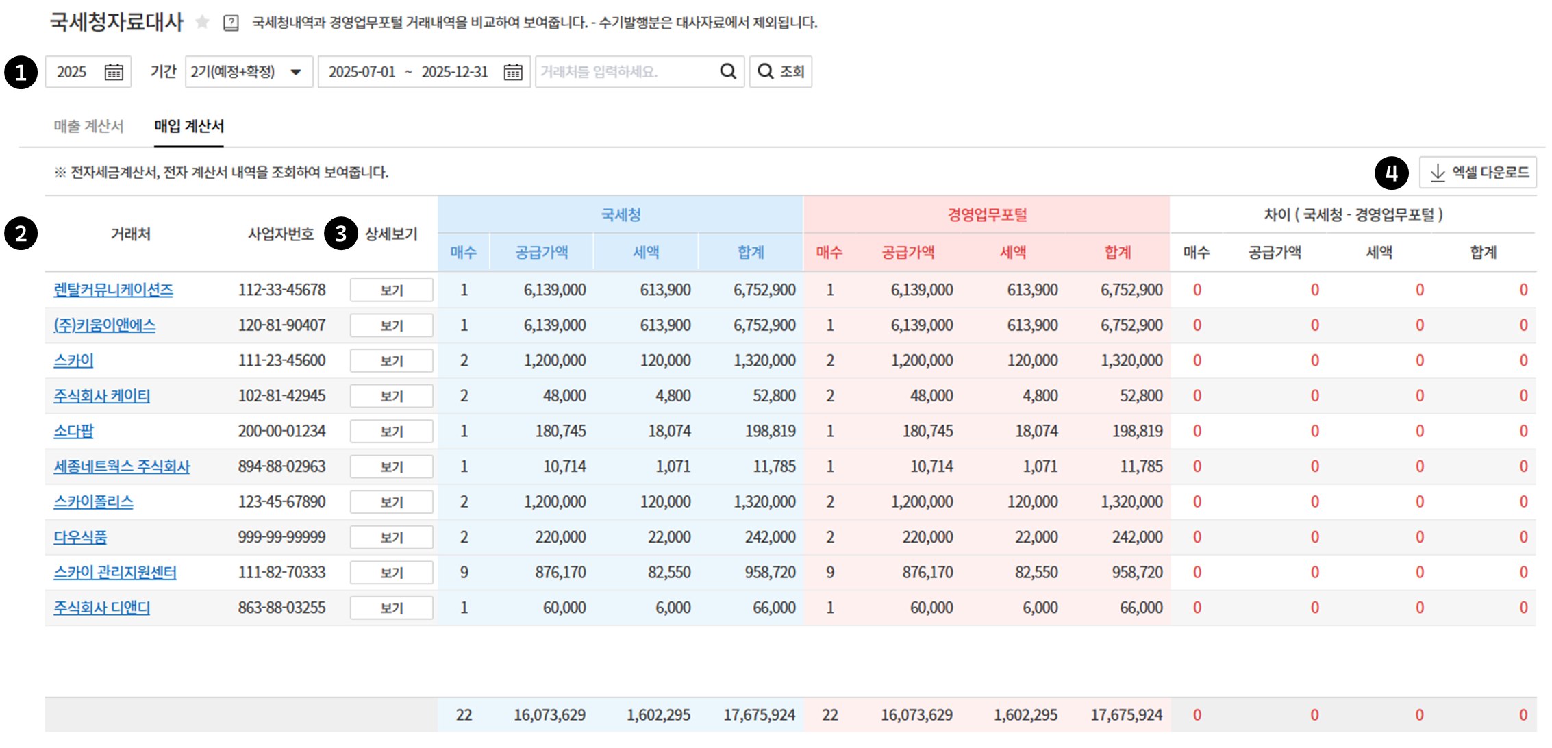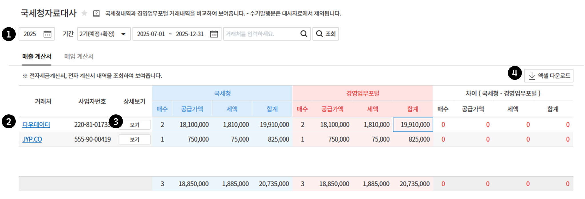 홈택스를 통해 전자 발행된 과세용·면세용·영세율용 세금계산서만 대사에 포함되고, 경영업무 포털에서 수기로 입력한 건은 포함되지 않습니다.