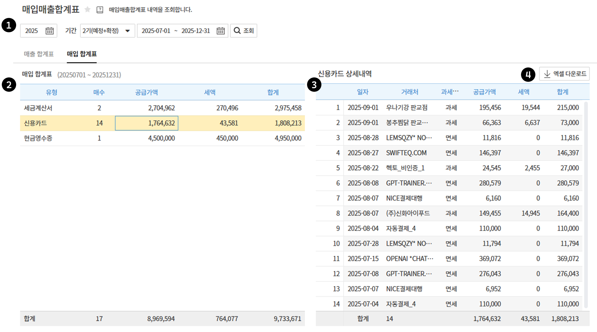 - 매입합계표 조회 : 매입 증빙유형별로 매수, 공급가액, 세액, 합계에 대한 내역 확인 가능