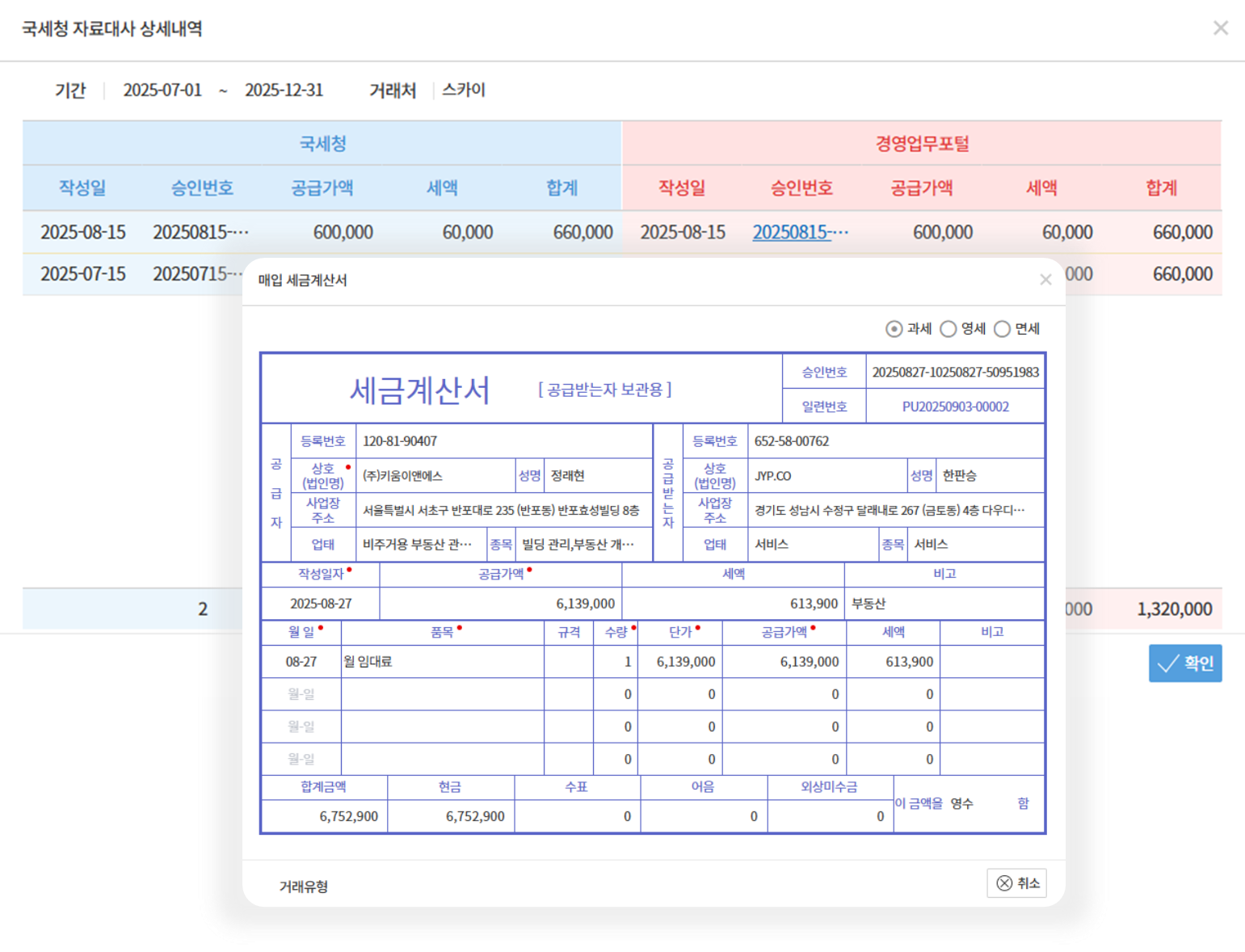 - 조회 내역 : 국세청 홈택스와 경영업무 포털에 있는 매입(세금)계산서 내역 및 차이 조회