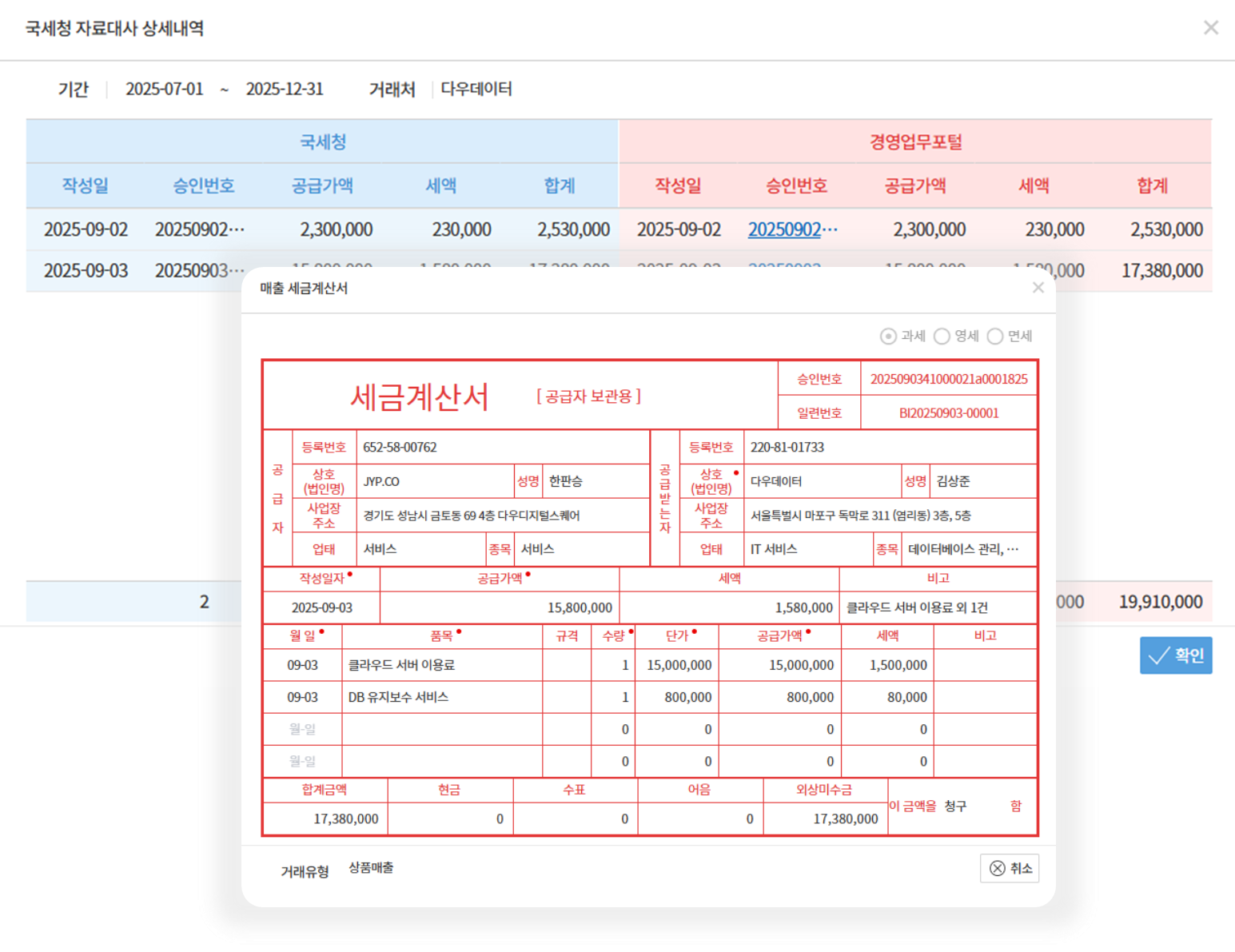 - 조회 내역 : 국세청 홈택스와 경영업무 포털에 있는 매출(세금)계산서 내역 및 차이 조회