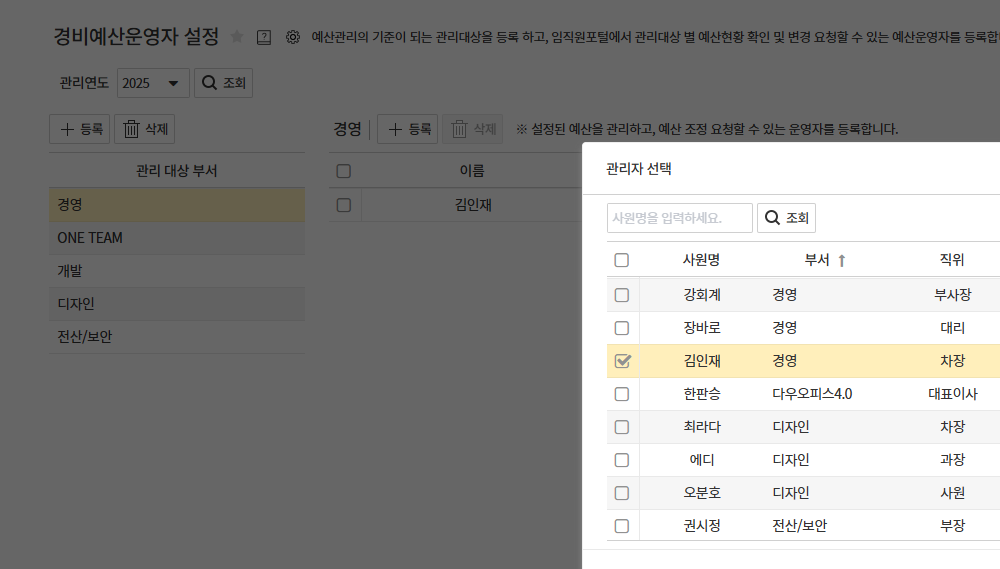 - 예산운영자 등록/삭제 : 좌측에서 선택한 관리대상별로, 예산 관련 업무를 수행할 예산운영자를 등록하거나 삭제