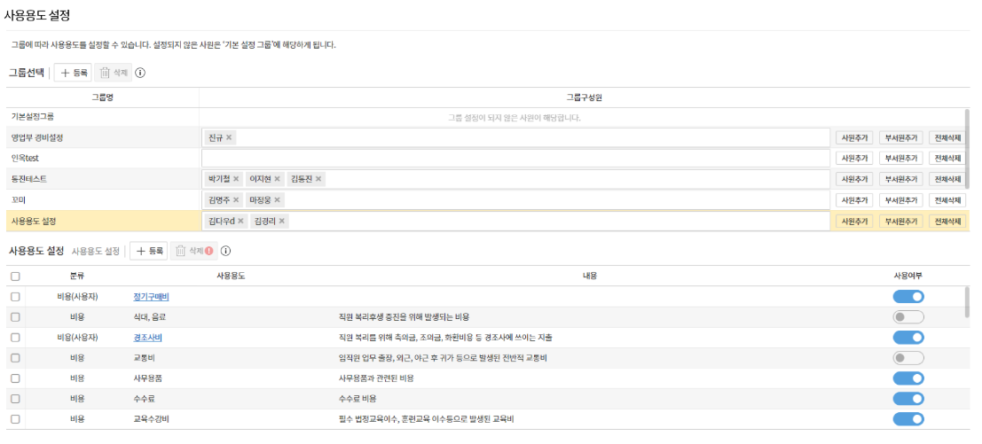 경비 청구 시 사용할 사용용도 그룹 등록 예) 식대, 음료, 교통비 등 분류