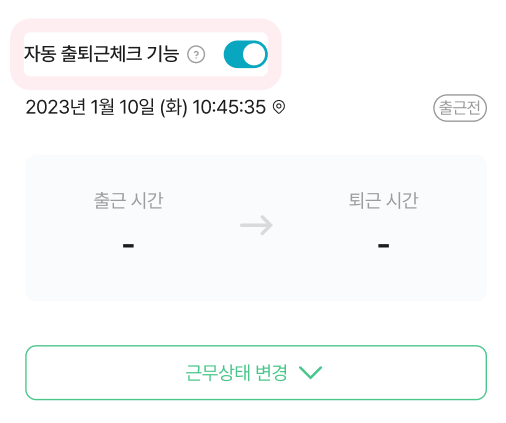 - 임직원이 출/퇴근체크를 하지 않아도, 설정된 근무 정책에 따라 출퇴근기록이 자동으로 기록되도록 설정된 회사(근무그룹)이라면 아래와 같이 토글이 활성화 되고, 출/퇴근 버튼 미노출 '