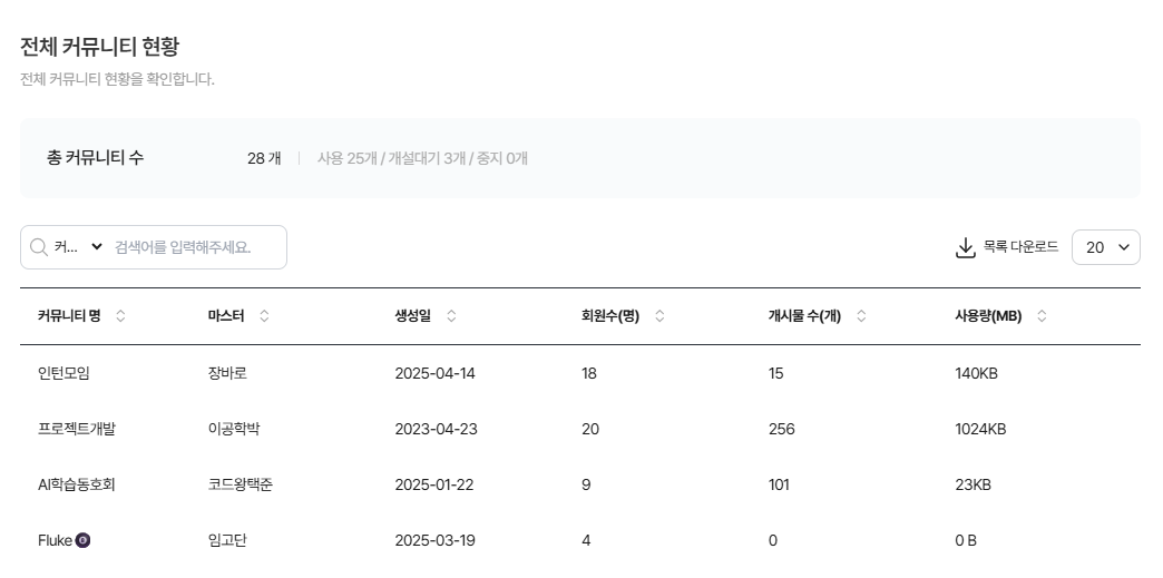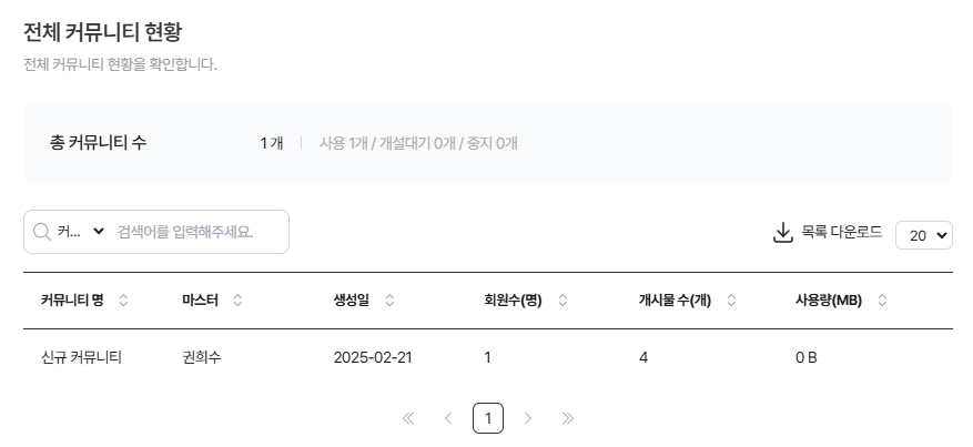 생성된 커뮤니티 목록을 통해 커뮤니티 명, 마스터 명, 생성일, 회원수, 게시물 수, 사용량 정보를 조회할 수 있습니다.