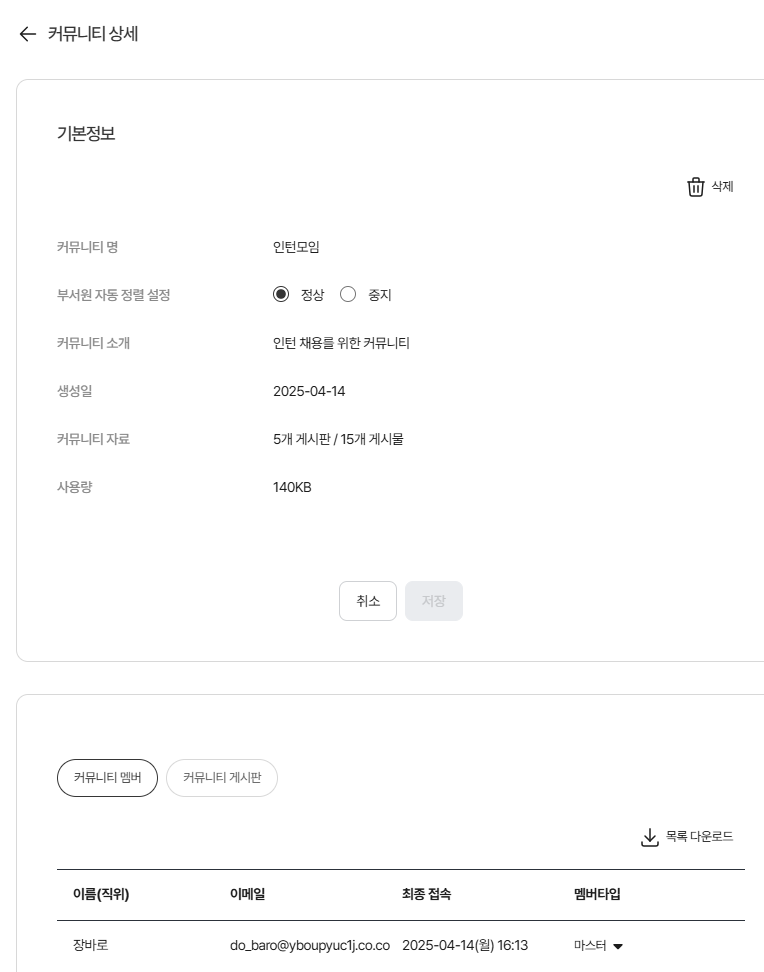 - 커뮤니티 명, 부서원 자동 정렬 설정, 커뮤니티 소개, 생성일, 커뮤니티 자료 정보, 사용량 확인