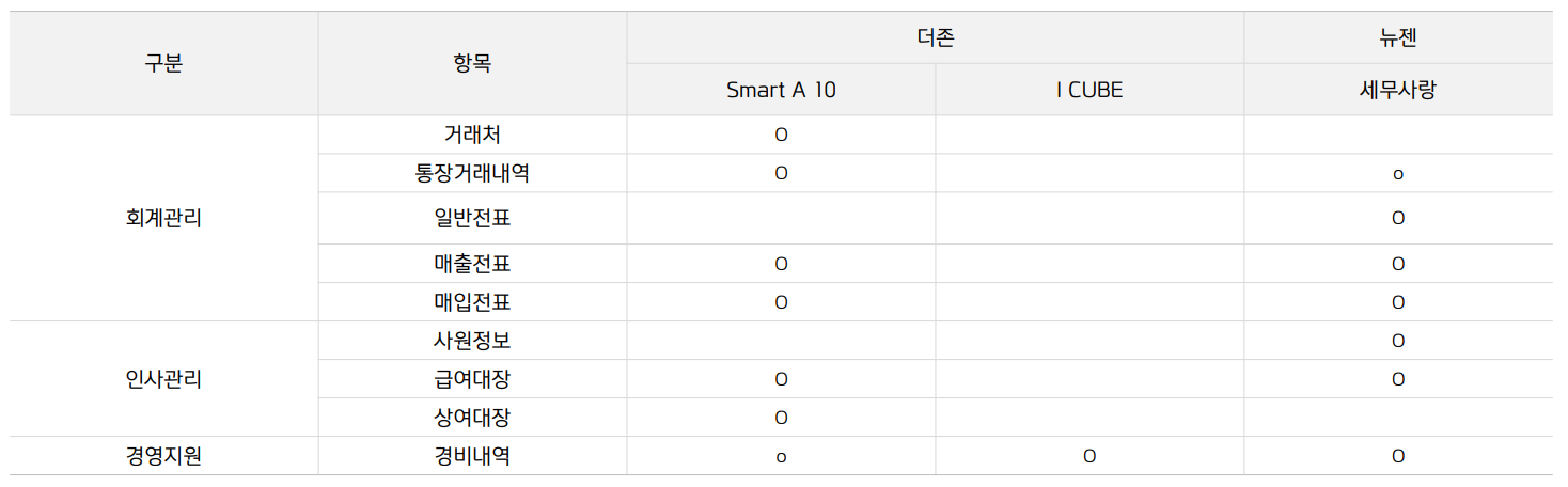 법인카드, 인사/조직(부서)정보, 거래유형, 프로젝트 정보, 회사코드 자료 연동이 가능합니다.