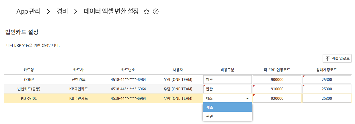 회계 전표 자동처리를 위해 카드마다 비용구분, ERP 연동코드, 상대계정 코드를 지정해야 하며, 이 설정에 따라 엑셀 변환 및 업로드 시 자동으로 반영됩니다.