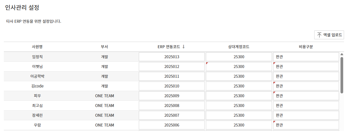 - 업로드 대상 : 비용구분, ERP 연동코드, 상대계정 코드