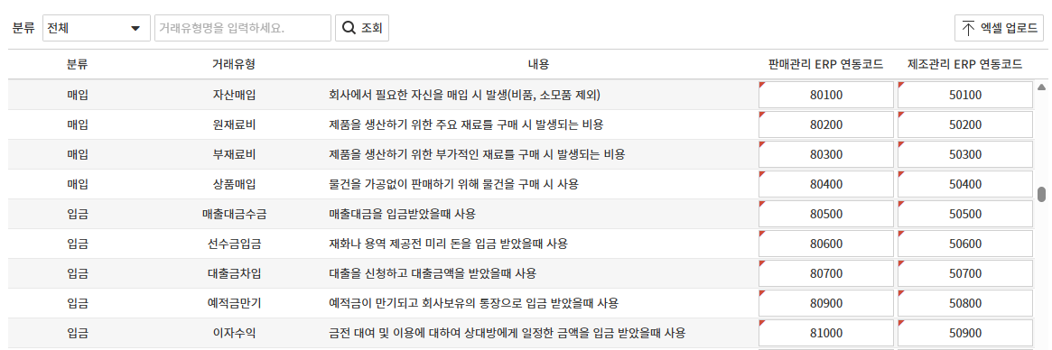 - 업로드 대상 : 거래유형명, 판매관리 ERP 연동코드 (800번대), 제조관리 ERP 연동코드 (500번대)
