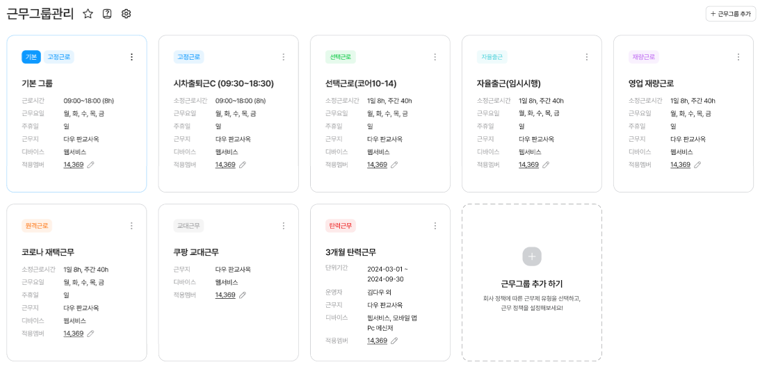 각각 다른 근무제와 근태 설정을 적용한 여러개의 근무 그룹을 설정하여 근무 그룹별 임직원의 근태를 효율적으로 관리할 수 있습니다.