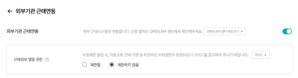 📑통합설정⚙️ > 근태 기본설정 가이드 내 '외부기간 근태연동'