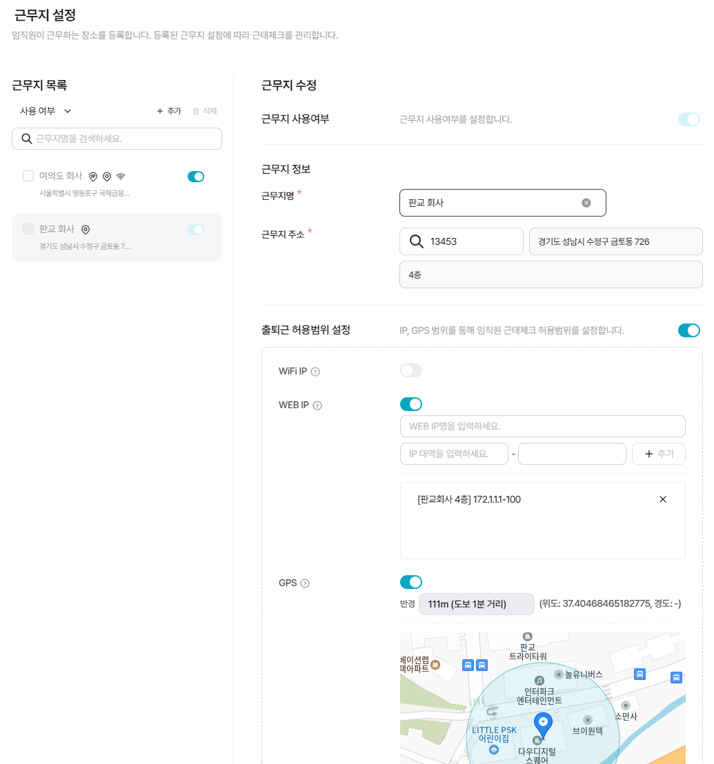 근무지 설정 및 IP, GPS, WiFi 범위를 통한 출퇴근 위치 관리