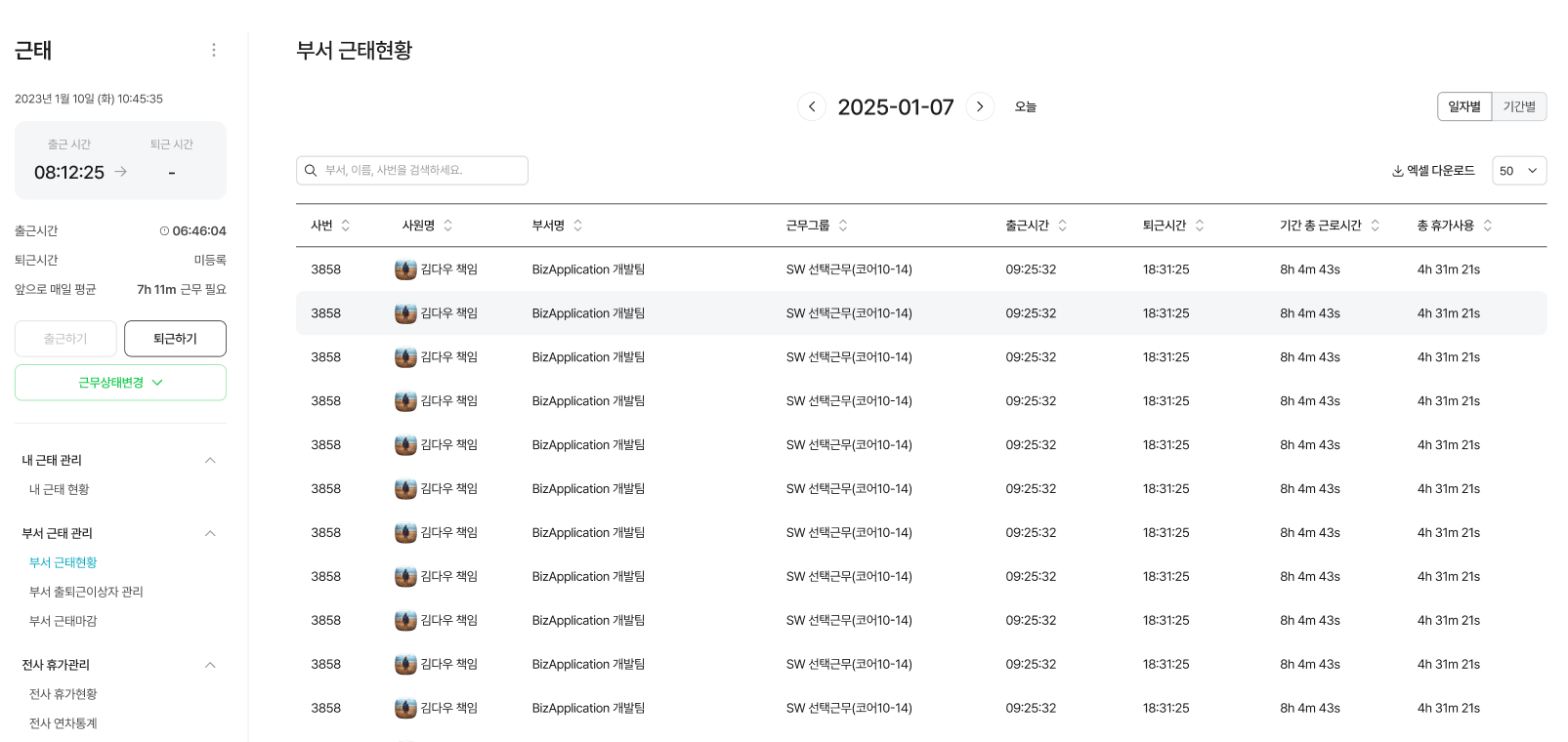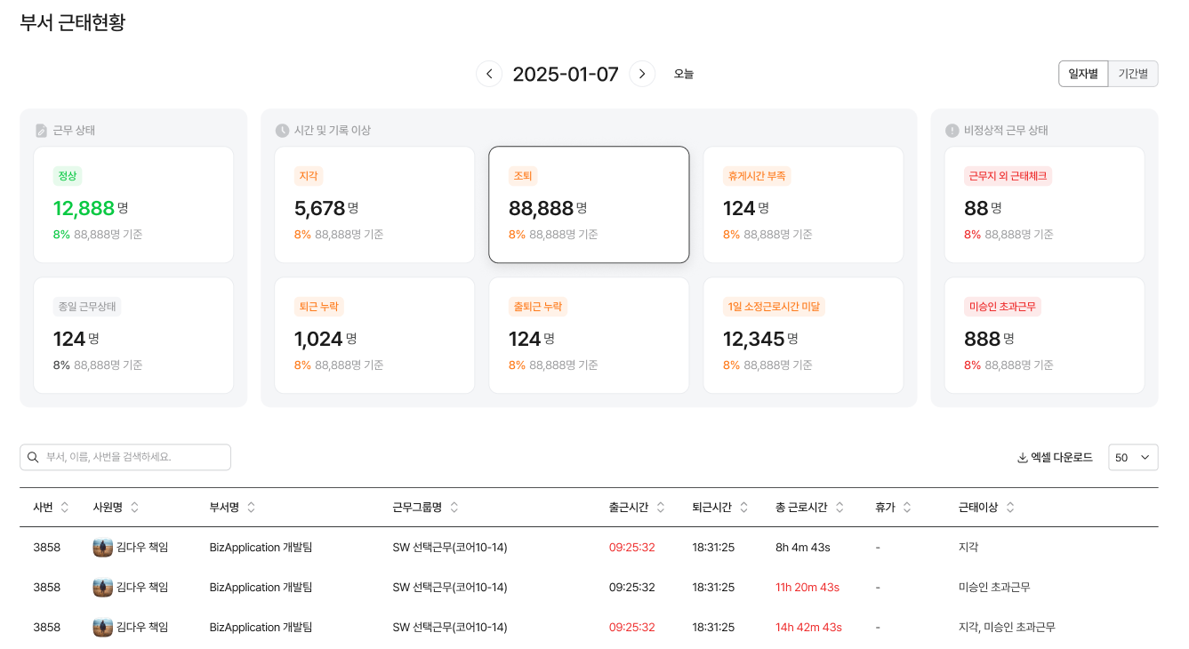 부서장(부부서장), 근태 App 운영자라면 소속 부서원 혹은 전사 임직원의 근태 현황을 한 눈에 확인하고 관리할 수 있습니다.