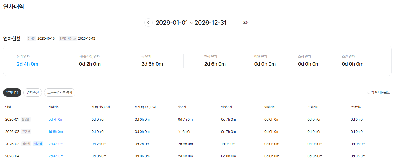 | 잔여연차 | 아직 사용하지 않은 연차 (발생연차 - 사용연차) |