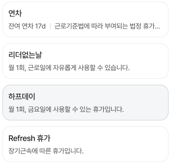 본인이 사용할 수 있는 휴가 유형을 카드 형태로 표시하고 있으며, 원하는 카드를 선택하면 바로 휴가 신청이 가능합니다.