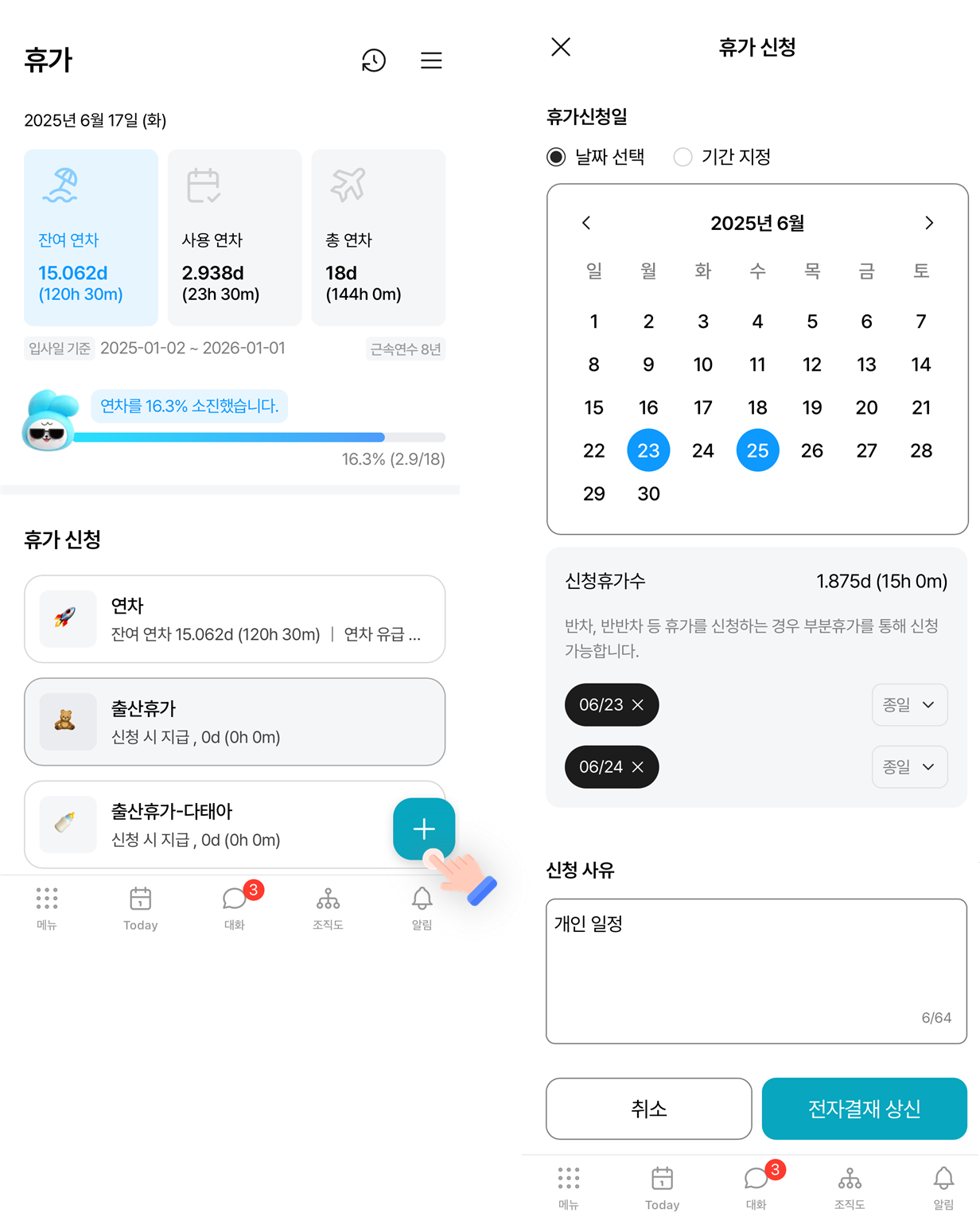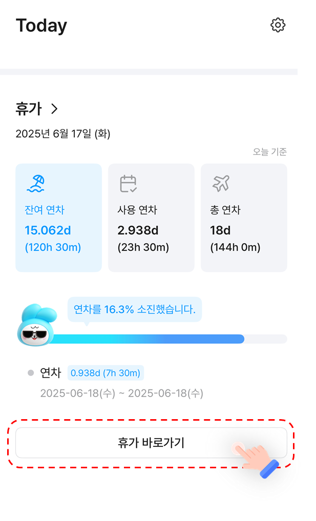 모바일 앱에서 휴가 기능을 활용하면 연차 현황을 쉽게 확인하고, 간편하게 휴가를 신청할 수 있습니다.