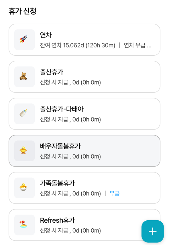 모바일 앱 내 휴가 App을 열고, 하단 [➕] 버튼을 선택하면 휴가 신청 팝업이 나타납니다.
