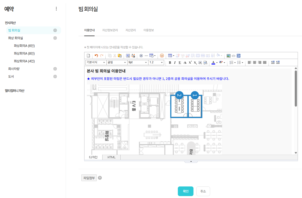 자산을 예약 또는 대여하려는 사용자가 숙지해야 할 내용이나, 자산의 특성 등을 기재할 수 있습니다.
