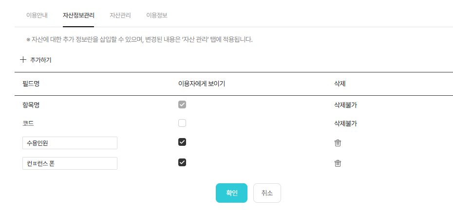 - [+추가하기] 클릭 > 필드명 및 이용자에게 보이기 여부 체크하여 자산 정보 추가