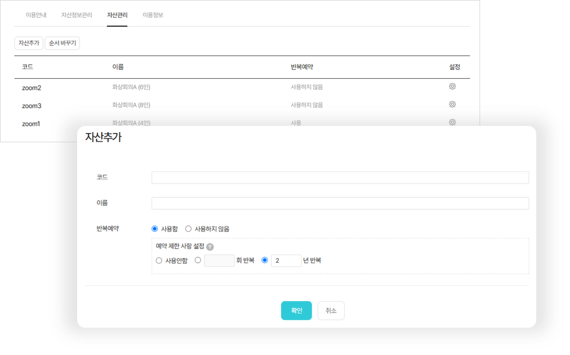 예약 App 관리자는 아래의 자산 항목을 설정하고 관리할 수 없습니다.