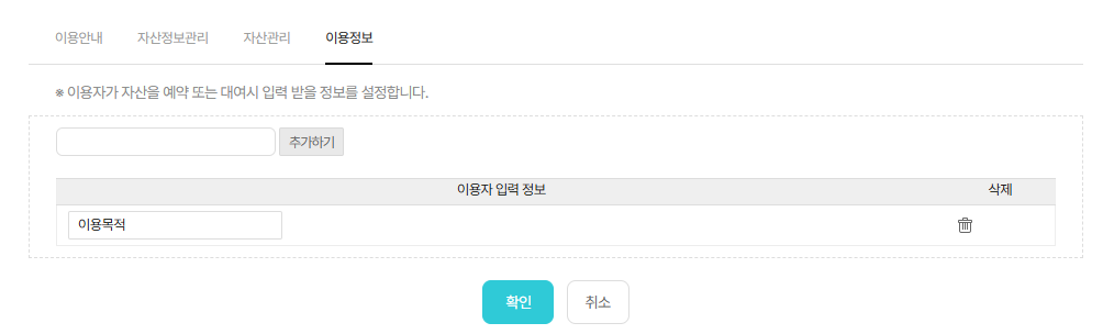 예를 들어, 차량을 예약할 때 '목적지', 회의실을 예약할 때 '사용 목적' 등을 필수로 입력하도록 항목을 추가할 수 있습니다.
