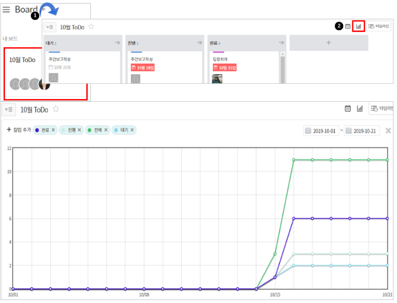 추이 그래프는 일정 기간 동안의 카드 수를 칼럼별로 집계하여 시각화합니다. 진행 중인 업무의 흐름과 변화를 한눈에 파악할 수 있습니다.