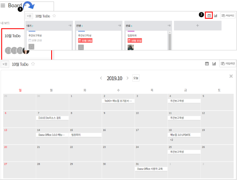 카드에 기한일이 설정되어 있으면, 보드 상단의 달력 아이콘을 통해 캘린더 형태로 일정을 확인할 수 있습니다.