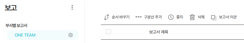 부서명 옆에 있는 ⚙️관리를 선택하면 보고서 전체 관리 화면에 진입할 수 있습니다.