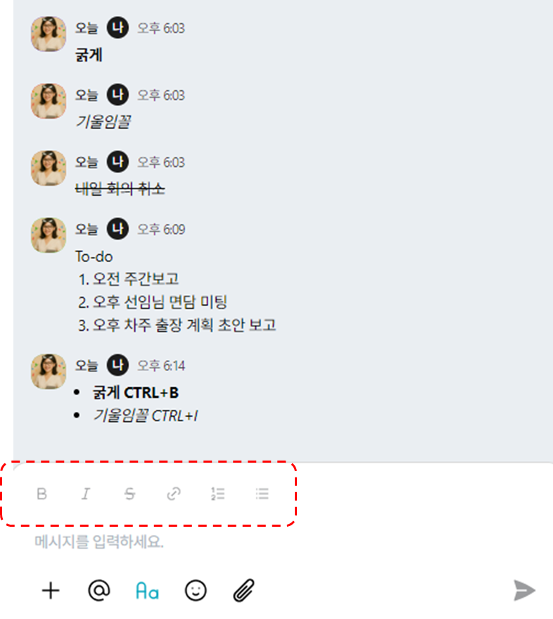 대화방 내 대화 시작 전, 기본 텍스트 외에도 다양한 서식 기능을 지원해 가독성이 높은 메시지를 작성할 수 있도록 도와줍니다.
