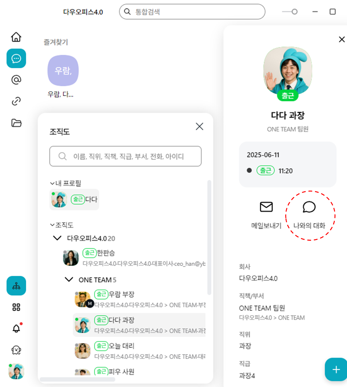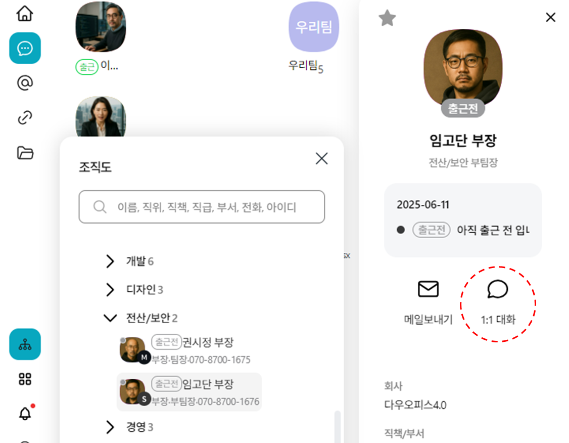 - 새대화를 원하는 사용자를 조직도에서 선택