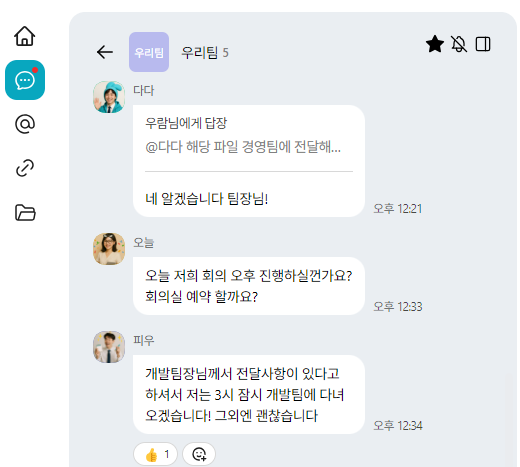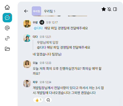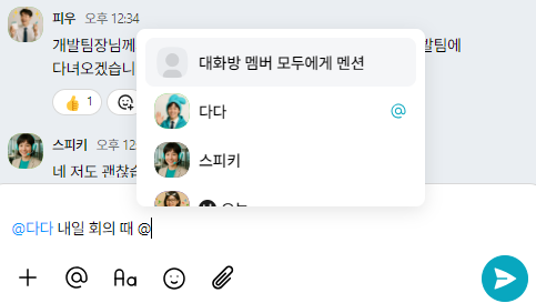 - 🙋♀️ @멘션 : 특정 멤버 또는 전체(@all)에게 알림을 통해 메시지를 명확하게 전달