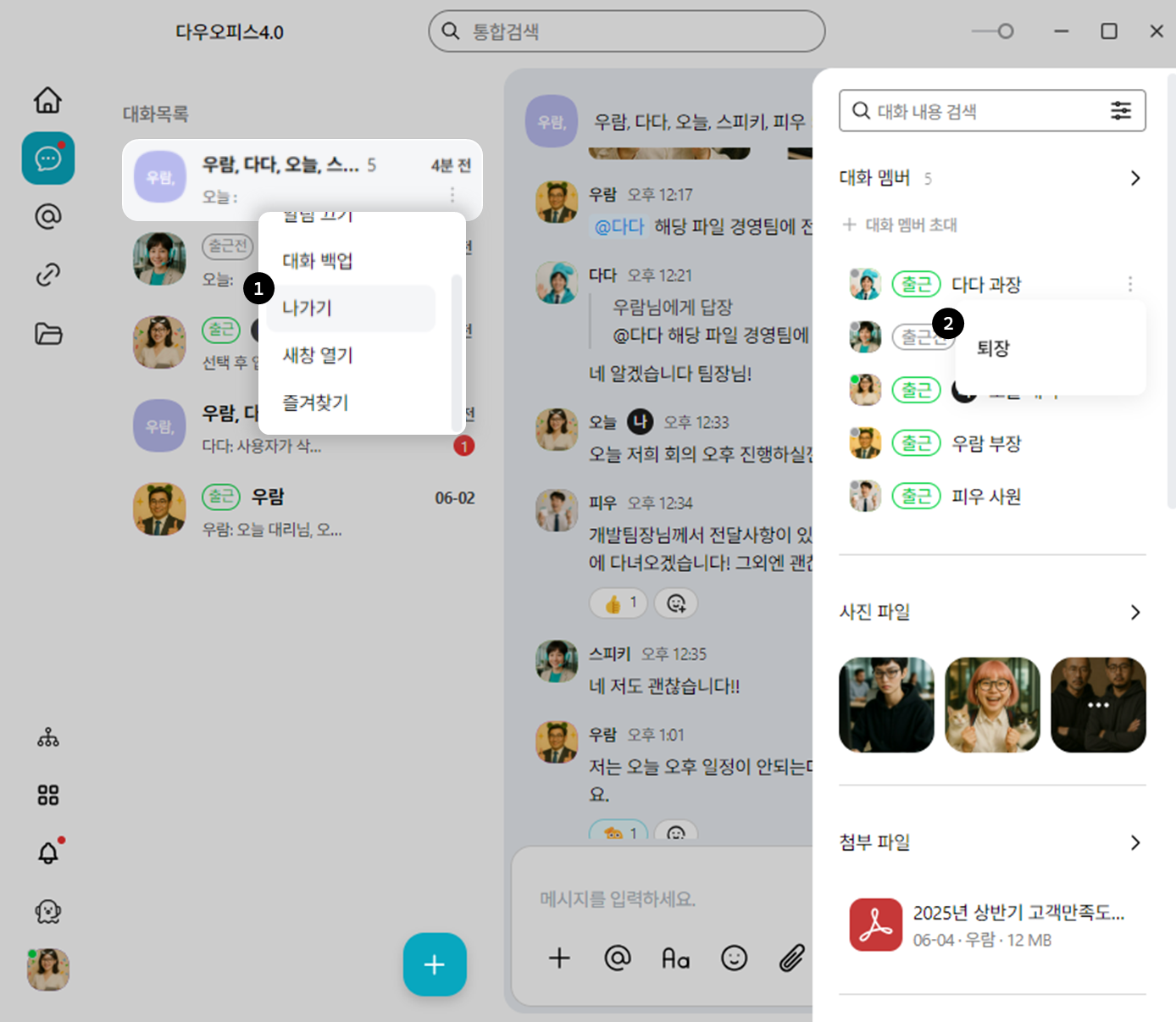 - PC메신저: 대화 목록 [···] 더보기 버튼 또는 대화 정보 더보기 메뉴 > [나가기] 선택