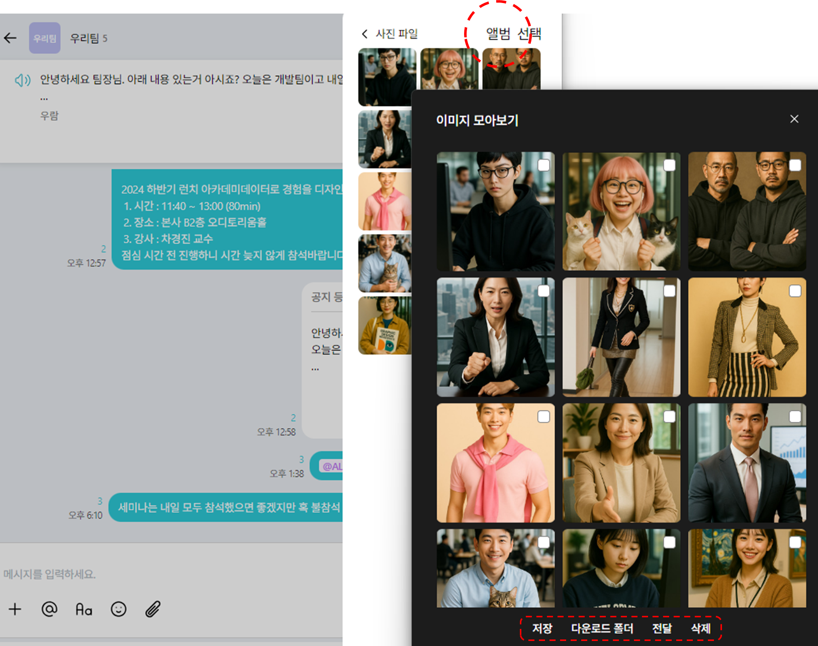 대화방에서 주고받은 첨부파일은 모아보기 기능을 통해 한눈에 관리할 수 있습니다.
