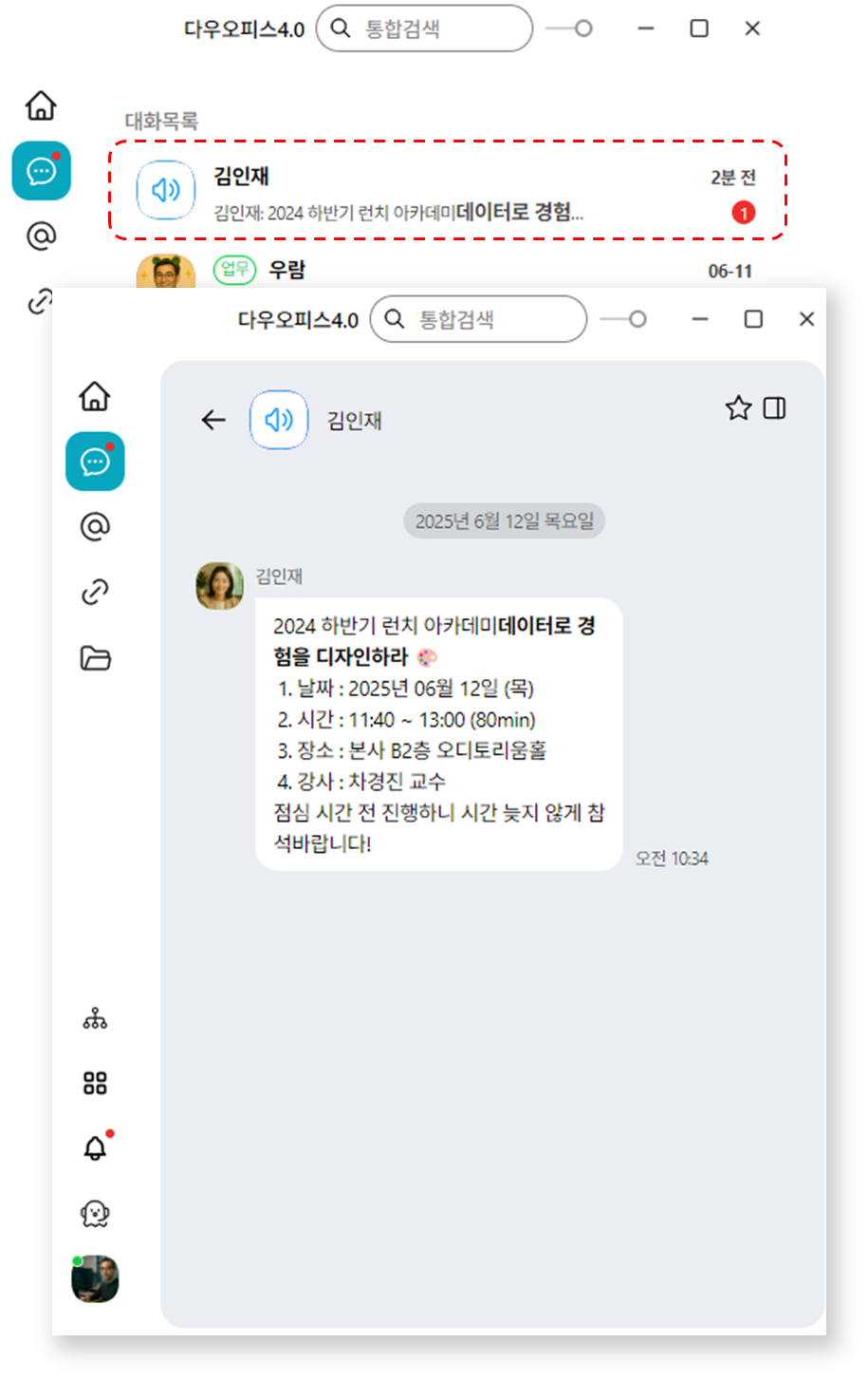 공지톡은 답장이 불가한 단방향 메시지로 메시지 입력창이 비활성화되어 수신자는 확인만 가능