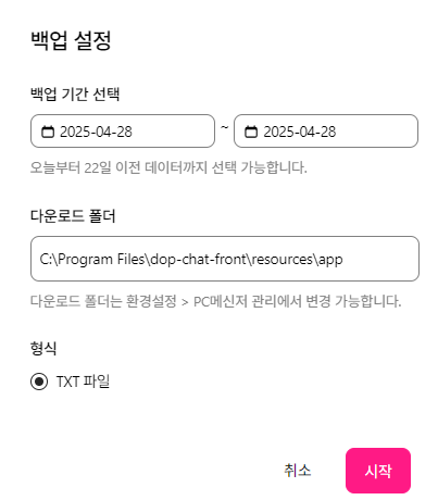 - 대화보관 기준일 설정에 따라 백업 최대 범위 지정 가능