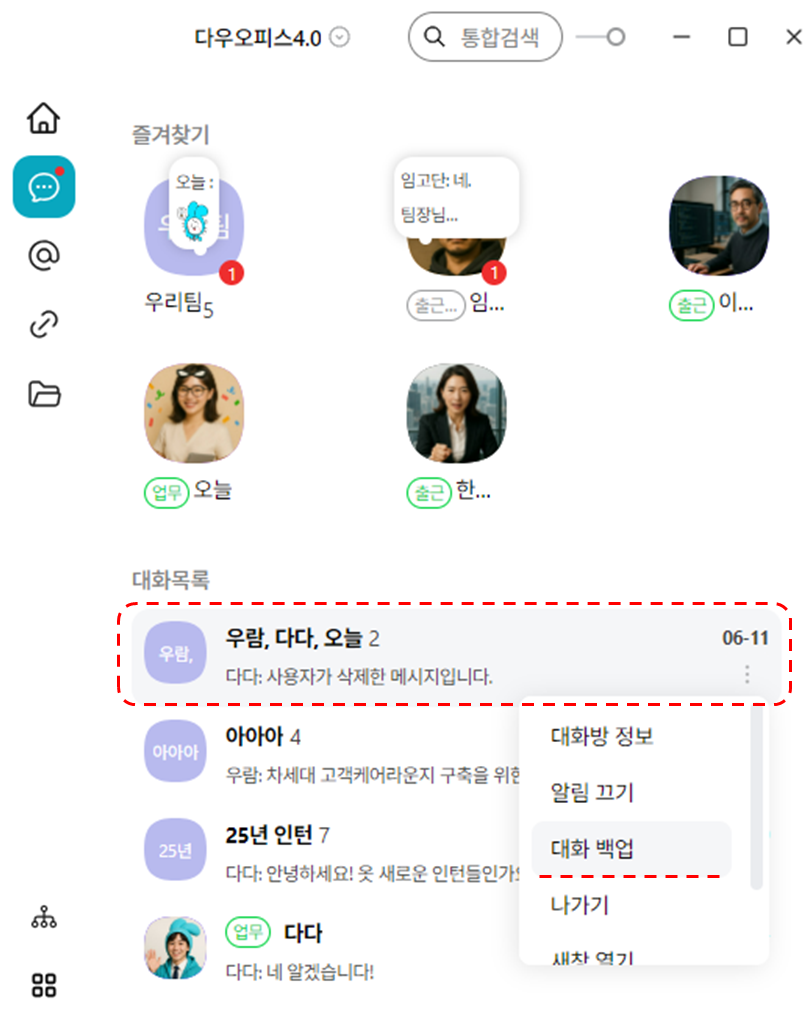 - PC메신저 대화 목록에서 백업하고 싶은 대화방에 마우스 선택