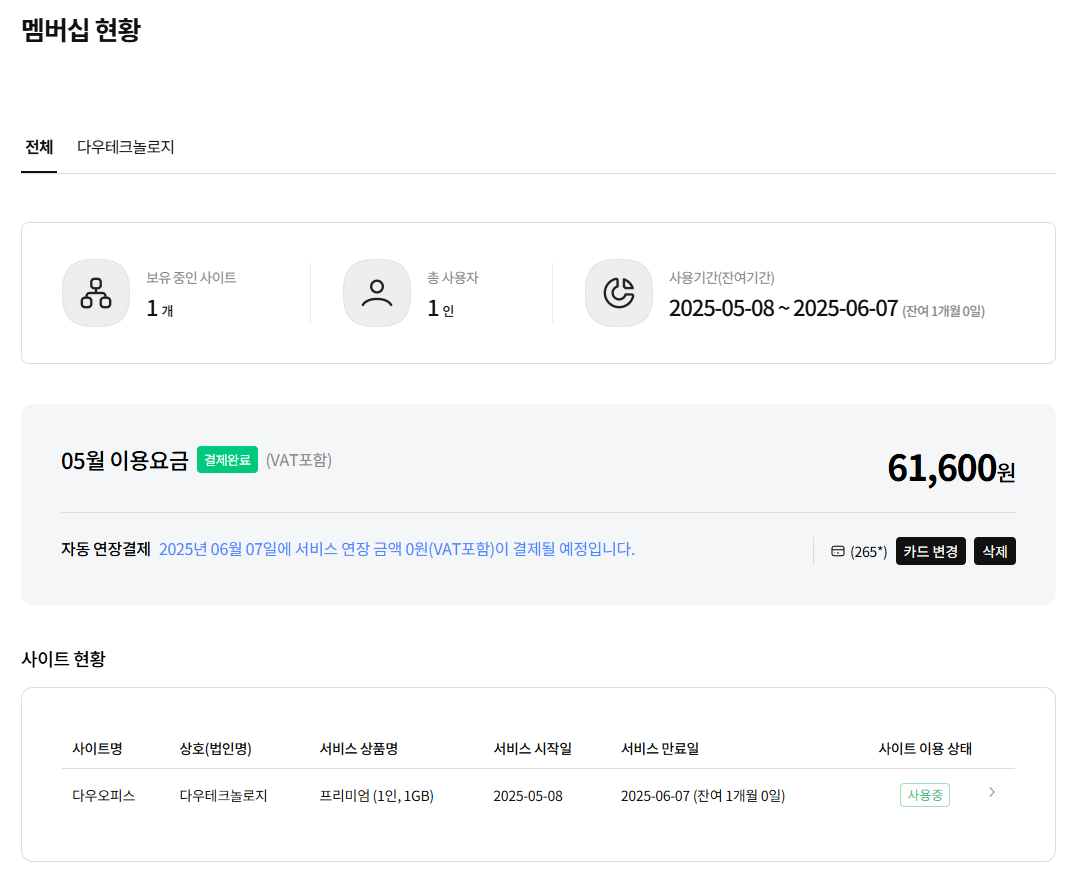 - 사용 기간/잔여기간 :대표 계약 기준의 사용기간과 오늘 기준 남은 일수