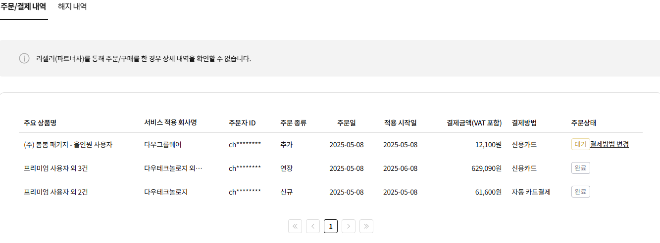 고객포털에서는 내가 신청하고 사용 중인 다우오피스 서비스의 계약 상태와 결제 내역을 한눈에 확인할 수 있습니다.