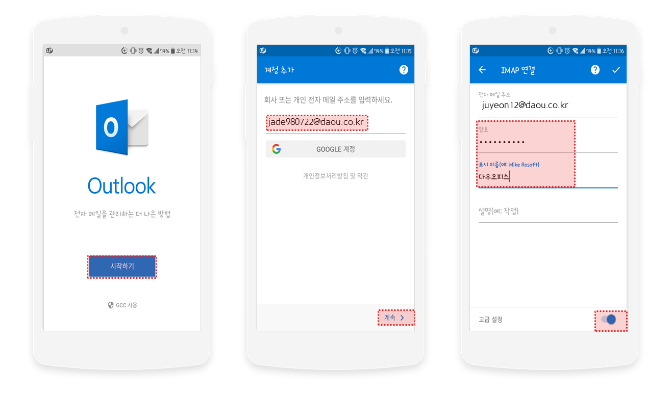 안드로이드 폰에서 아웃룩 앱을 실행시켜 IMAP계정을 추가합니다.