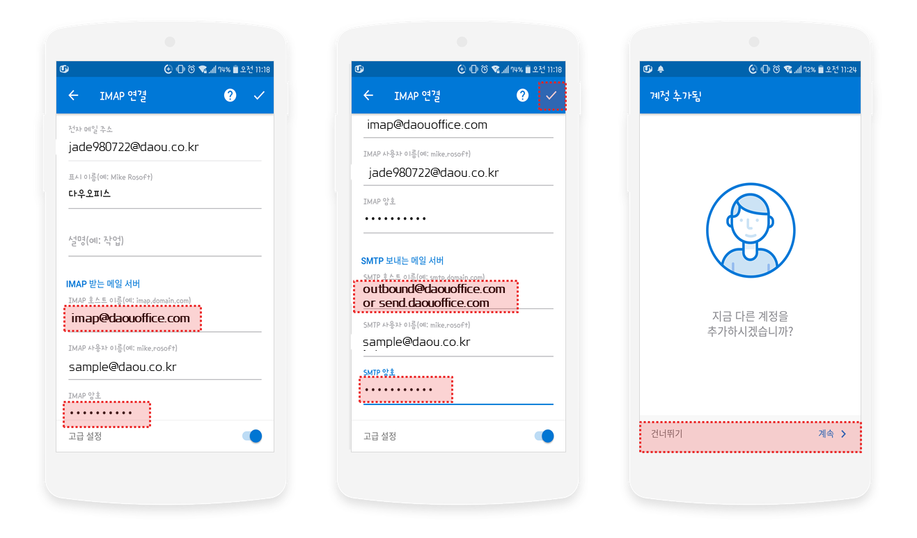 6. [IMAP 암호]에 다우오피스 비밀번호 입력
