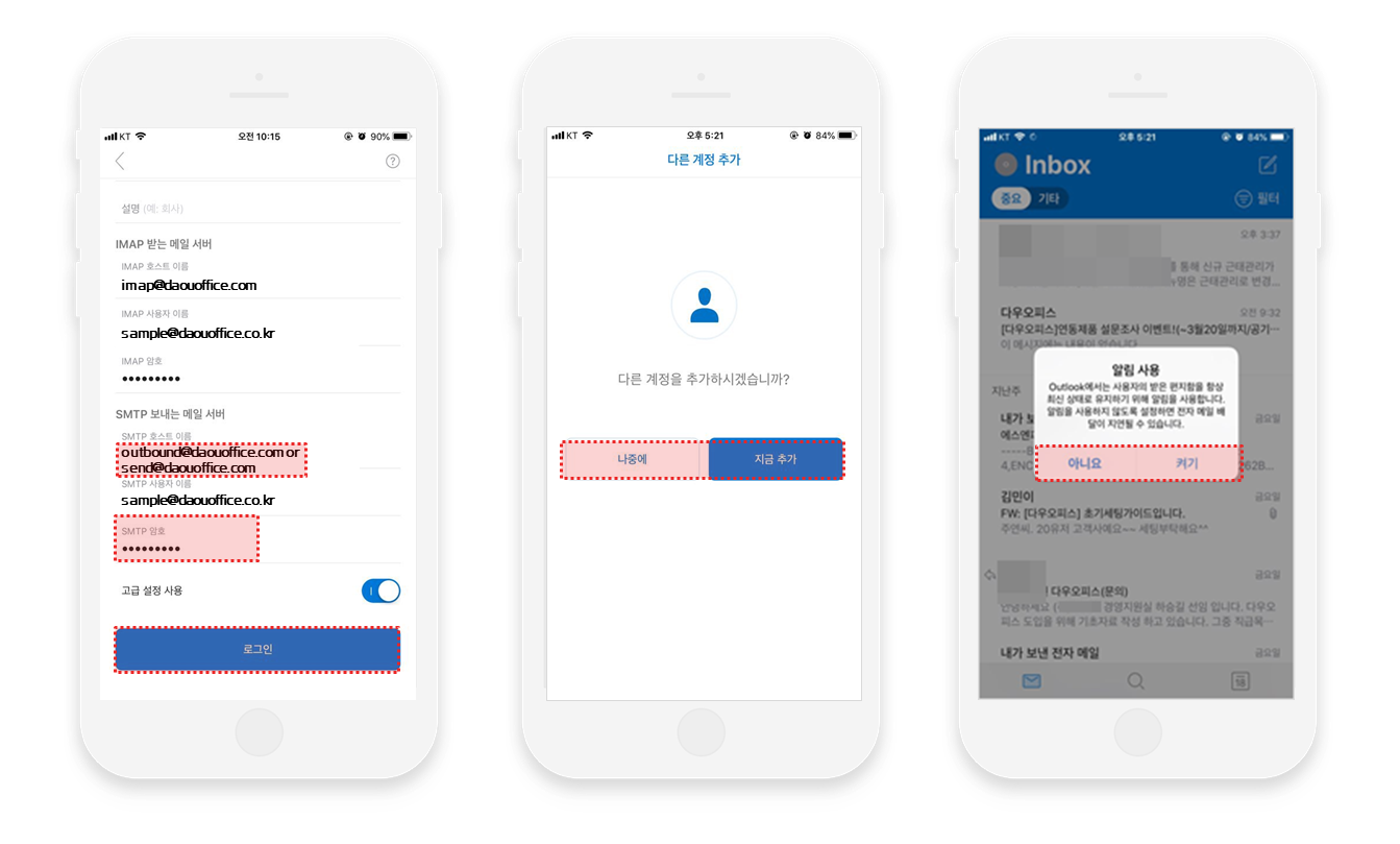 안내를 따라 아웃룩 앱에 다우오피스 메일을 연동해보세요.