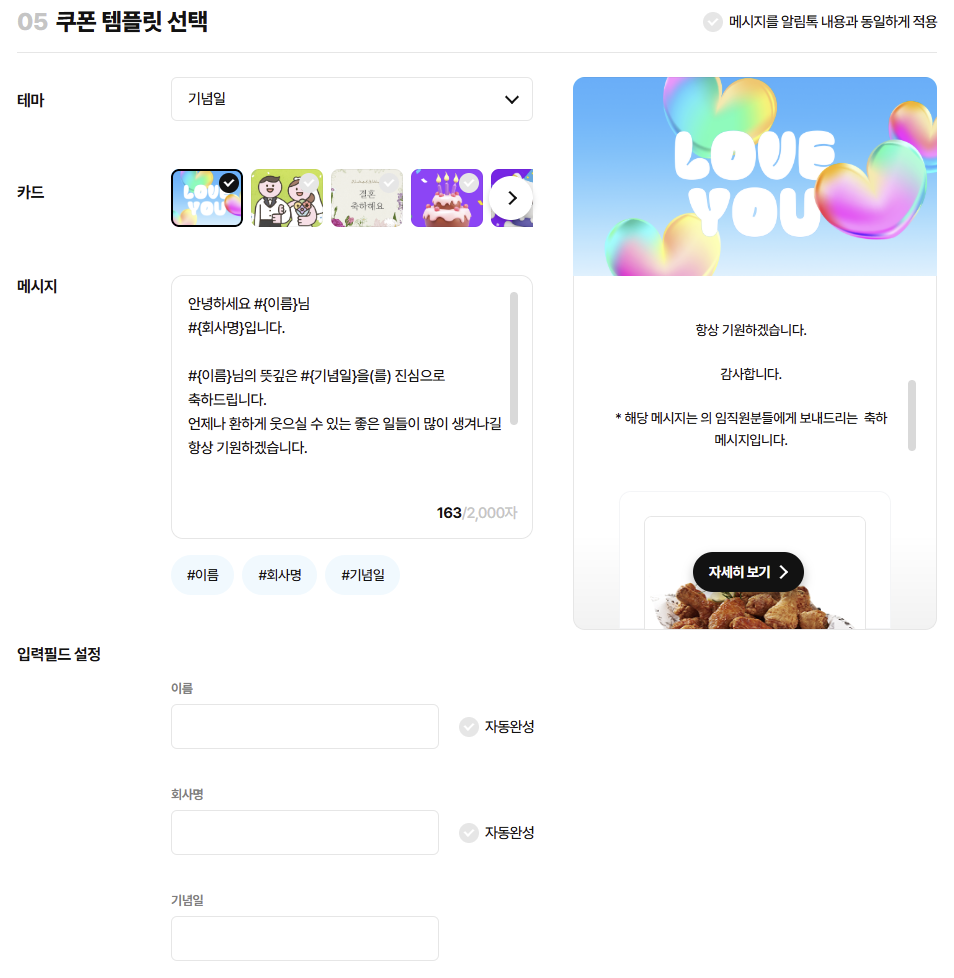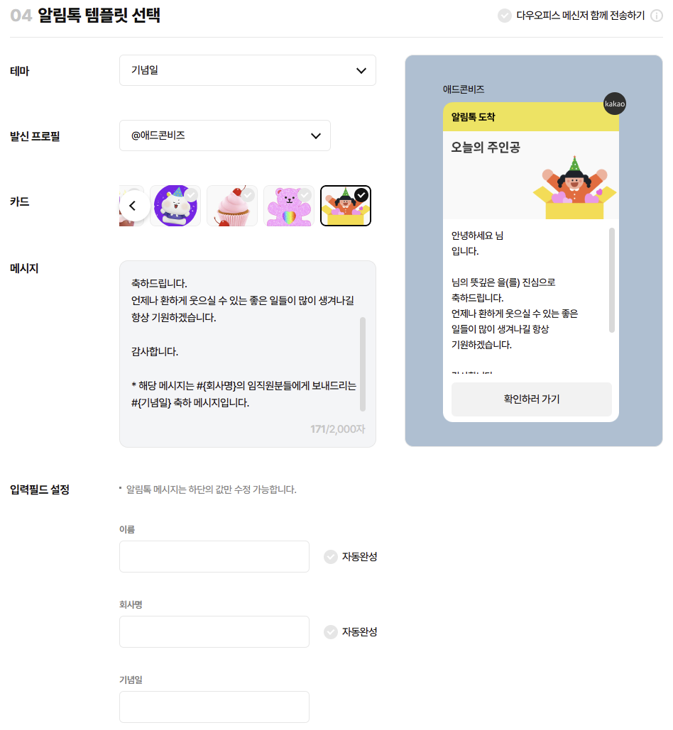 - 변수 처리 : 메시지 내용 안에 이름(수신자), 회사명, 기념일을 변수로 처리하면, 해당 부분은 하단에 입력필드가 생성되어 원하는 내용으로 입력 가능