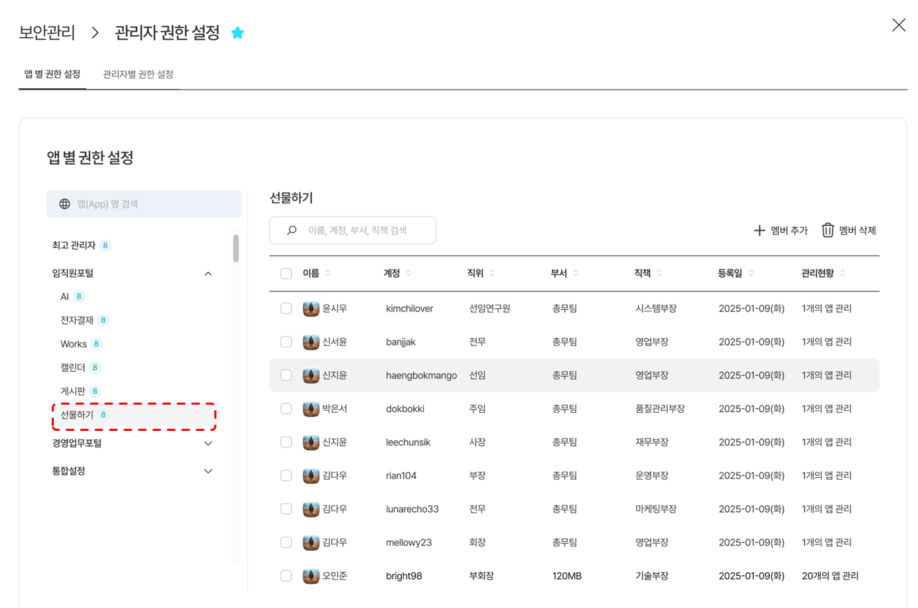 - 통합설정 > 보안관리 > 관리자 권한 설정 > 앱 별 권한설정에서, 임직원포털 > [선물하기] 클릭