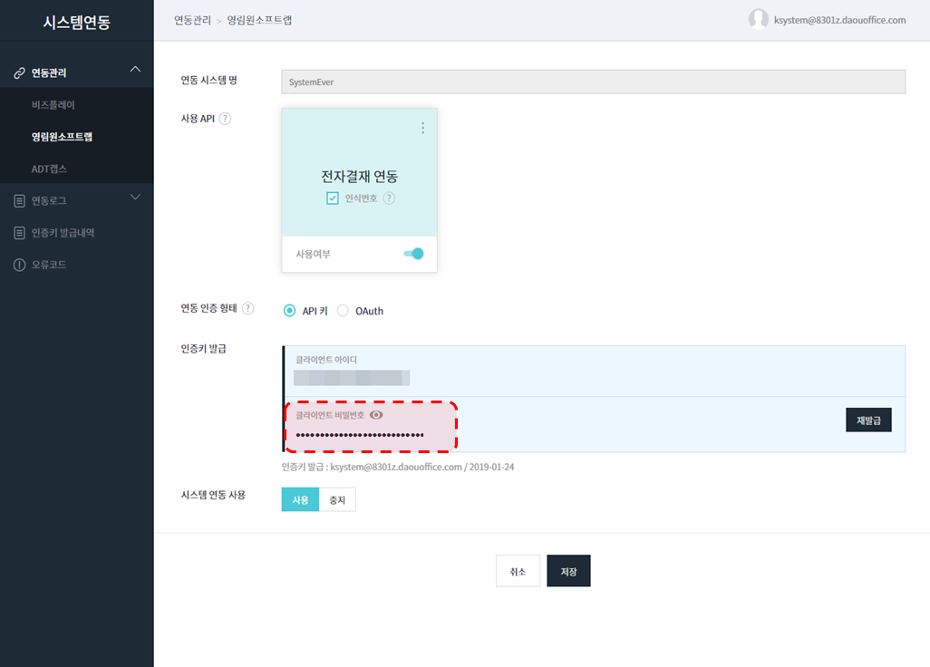 3. [저장] 클릭시 연동 인증키가 발급 됨